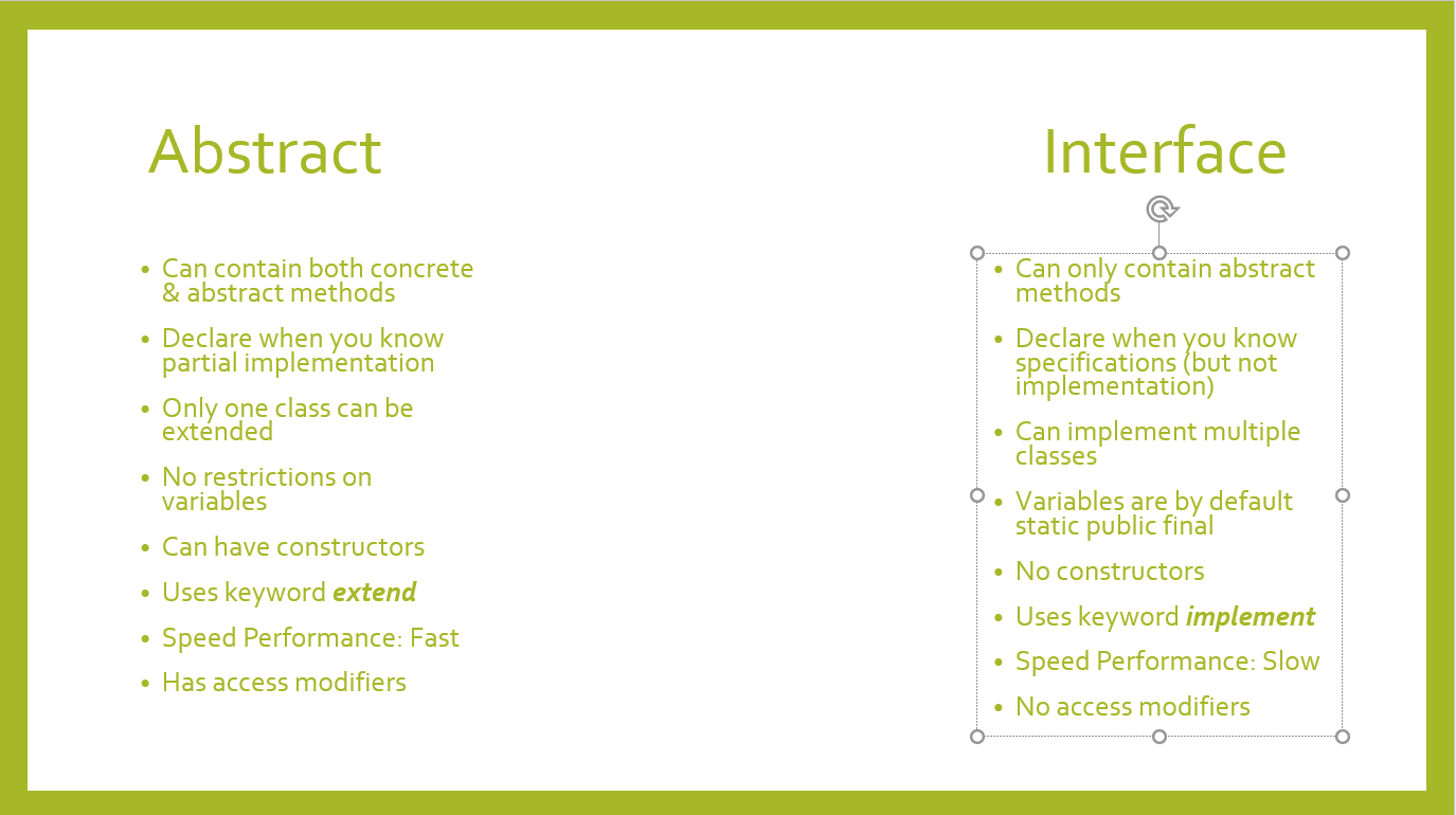 The Interface differs because it has no concrete methods inside of it, essentially acting as an empty class that passes through empty methods. The keyword interface is used to create the interface, and implements is used. Interfaces are used when you know what the specifications are, but you dont know how to implement the methods in said classes.