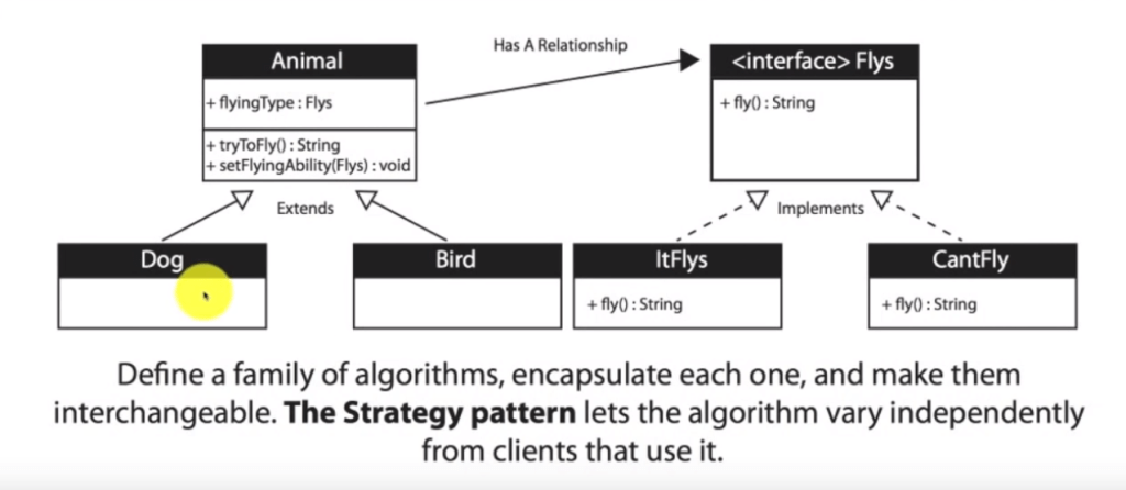 In this flow chart, we can see that class animal has a relationship with class flys. We want this because instead of adding a fly method to every new instance of animal, animal will have an instance of a fly interface, with classes itFlys and CantFly being part of the interface. From there, we can decide what does fly and what doesnt, allowing for more dynamic use of the fly class. For instance, if the bird couldnt fly anymore for some reason, but the dog can, we can change those variables without re structuring the code for animal, dog, or bird.