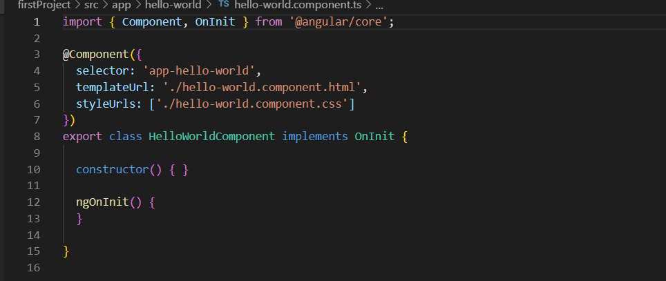 As we can see, this .ts file contains the css and the html for hello-world. They are packaged together with the @Component tag, signifying to Angular that these are components.