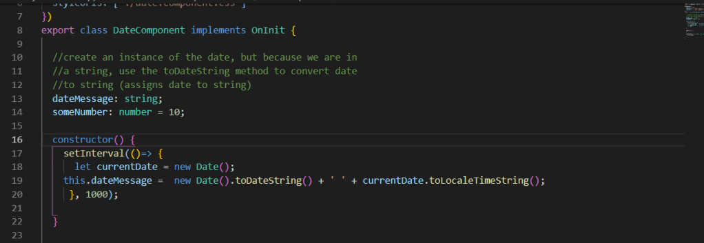 What we’re doing here is, after exporting the class, we create a variable String called dateMessage. Inside the constructor, create another Date variable. We will use the setInterval method to keep the time updated, and the string dateMessage will show the current date, along with the local time (counting every second).