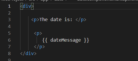 We have the logic set, but we need the logic to appear on the html. In the date-time.component.html, we need to find a way to pass the dateMessage variable to the html page. We can achieve this by using {{ }}.